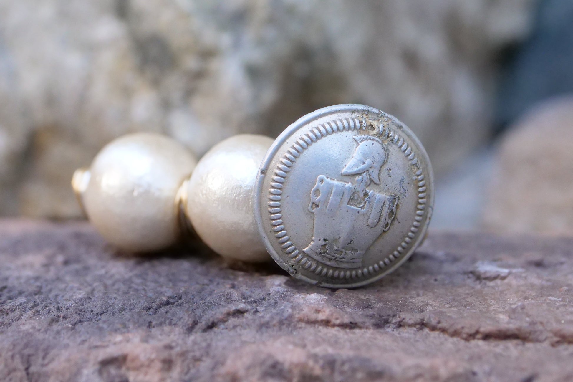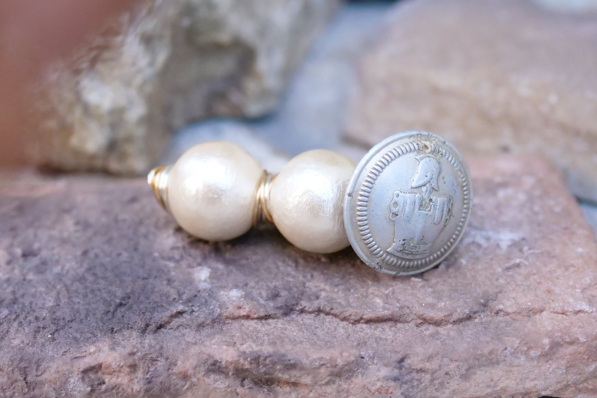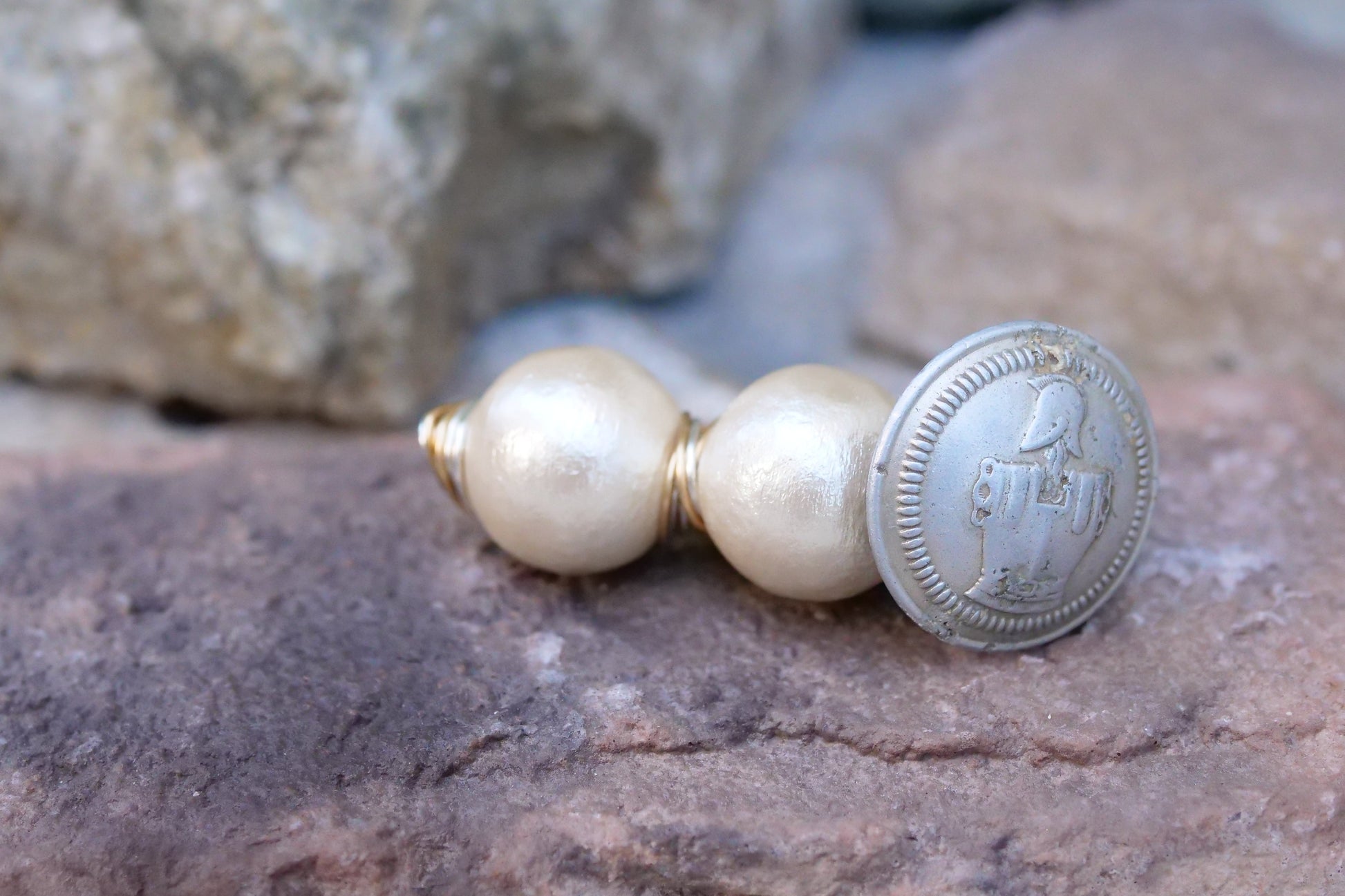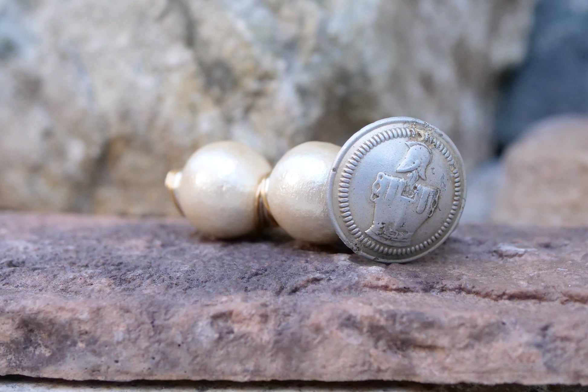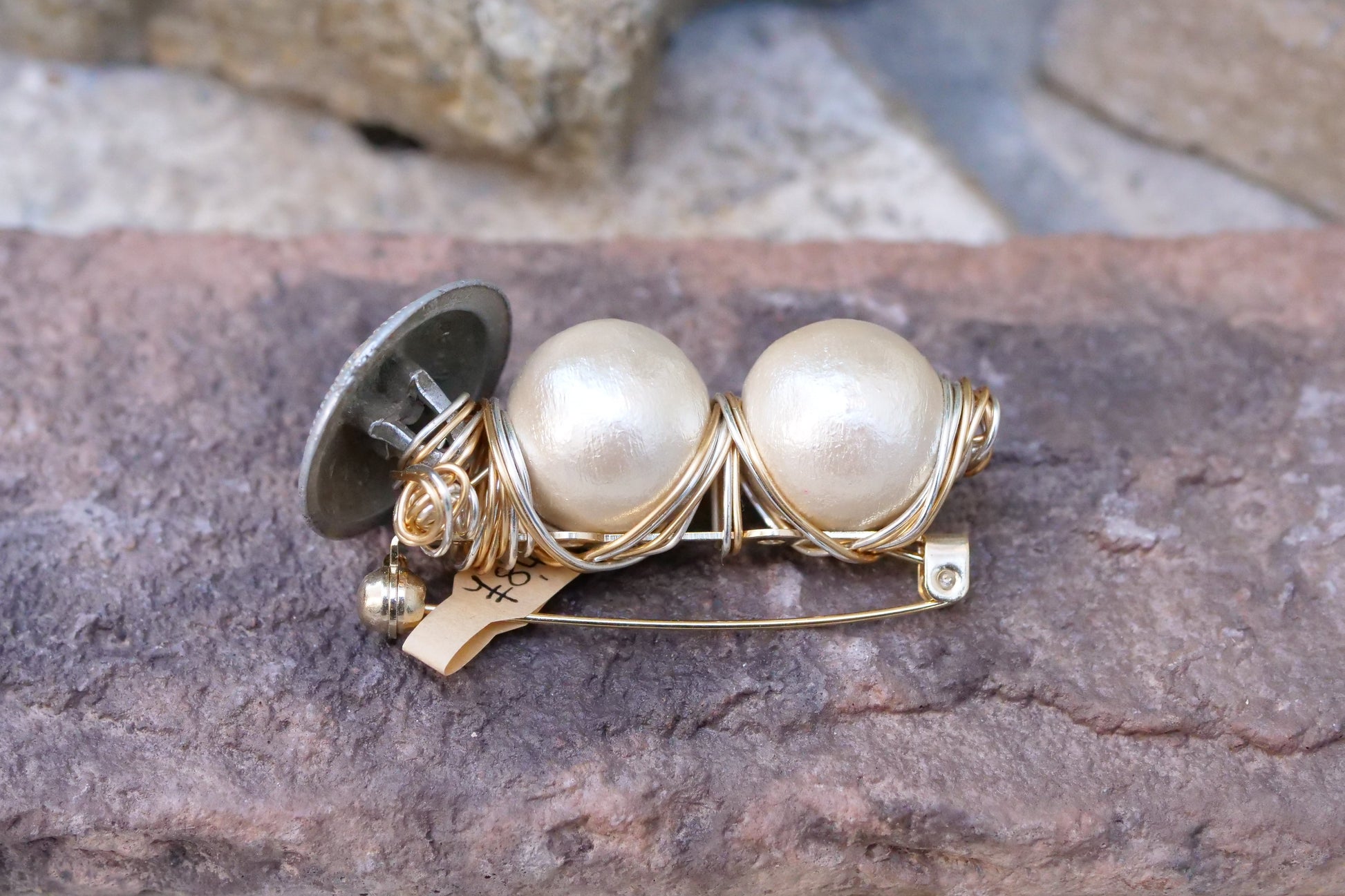 陸軍のアンティークなボタンに、大胆コットンパールを2つ連ねたブローチ