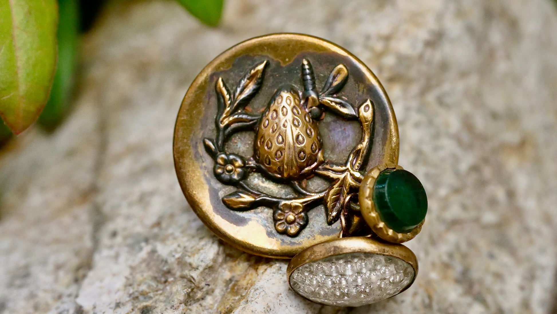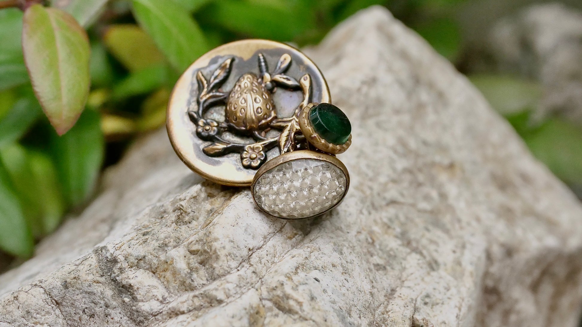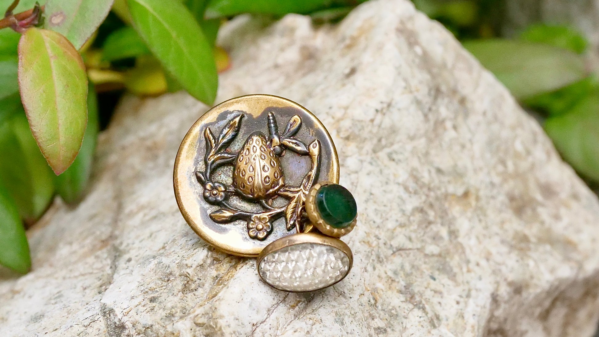 サイズ:金属ボタン直径約2.6cm. クリア1.5cm×1cm. 緑0.8cm. 全長約 2.6cm/3.5cm
